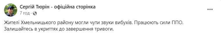 "На Хмельниччині чутно звуки вибухів, повідомляють кореспонденти Суспільного. В області оголошена повітряна тривога", - йдеться у повідомленні.