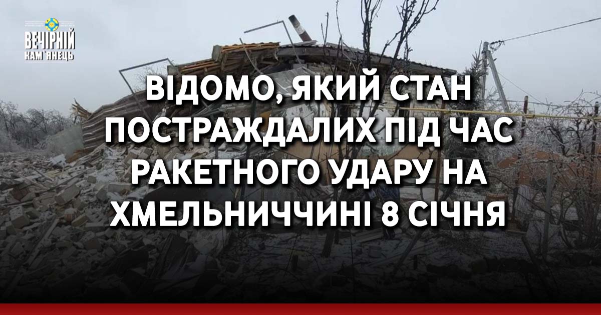 8 січня 2024 року унаслідок ракетної атаки на Хмельниччині двоє людей отримали травми. Наразі вони перебувають на амбулаторному лікуванні.