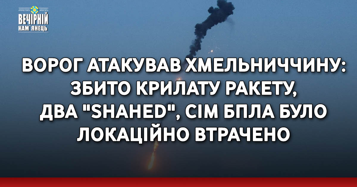 Як повідомив начальник Хмельницької ОВА Сергій Тюрін, під час сьогоднішньої нічної атаки силами ППО ЗСУ було знищено одну крилату ракету, два безпілотники типу "Shahed" та сім БПЛА було локаційно втрачено.