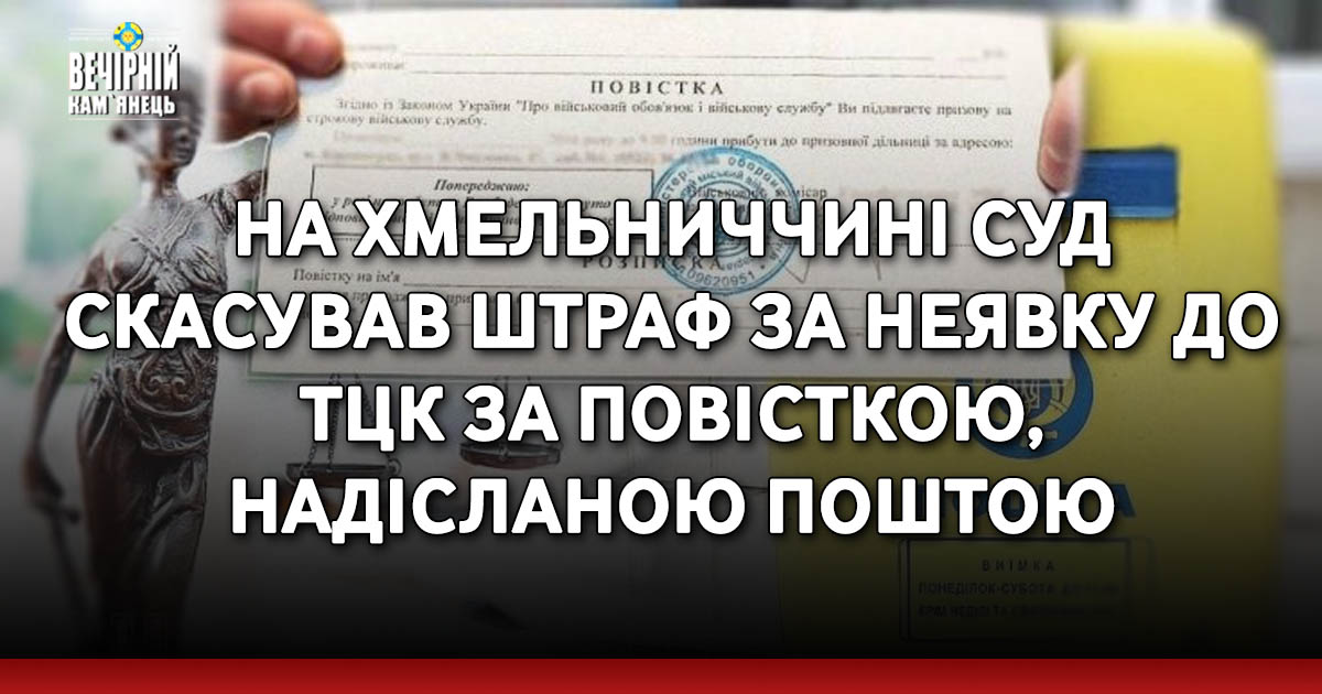 Нетішинський міський суд Хмельницької області задовольнив позов мешканця області та скасував постанову територіального центру комплектування і соціальної підтримки, якою чоловіка оштрафували на 17 тисяч гривень за нібито ігнорування повістки, надісланої поштою.