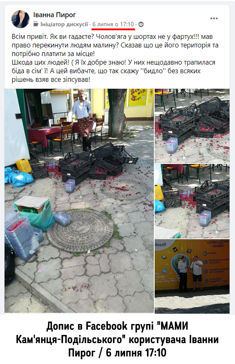 За словами користувачки, чоловік з фото, який був одягнутий в шорти та білу футболку, перекинув ящики з товаром (малину), оскільки продавець знаходився на "його території".