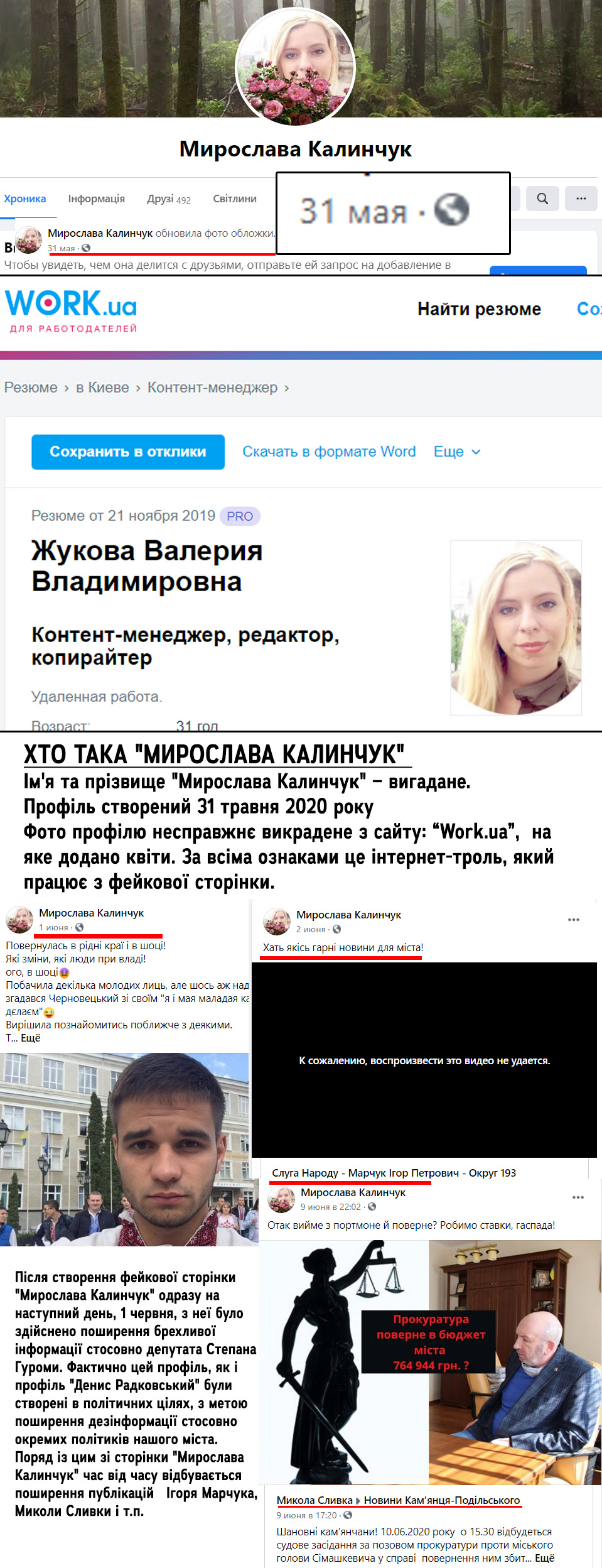 Після створення фейкової сторінки "Мирослава Калинчук" одразу на наступний день, 1 червня, з неї було здійснено поширення брехливої інформації стосовно депутата Степана Гуроми. Фактично цей профіль, як і профіль "Денис Радковський" були створені в політичних цілях, з метою поширення дезінформації стосовно окремих політиків нашого міста.