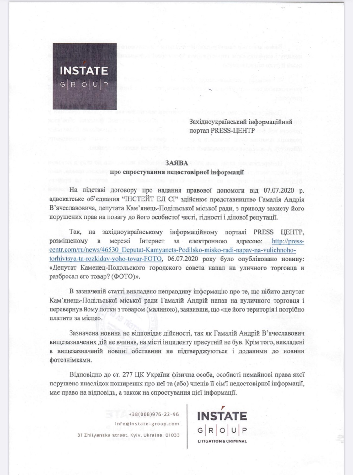 "Вже зареєстровано мою заяву до поліції, працюють слідчі. Статтю з сайту вже видалили, але вибачень я так і не отримав. Тому прийняв рішення передати всі наявні матеріали адвокатам для оформлення позовної заяви до суду. Я впевнений, що люди, які стоять за поширенням брехні та наклепу, повинні понести відповідальність, в тому числі й матеріальну. Звичайно сума буде символічна, але достатня для того, щоб в одній із палат Хмельницької обласної психіатричної лікарні в с. Скаржинці було зроблено ремонт, куди згодом потраплять брехуни", - відзначає А.Гамалій.