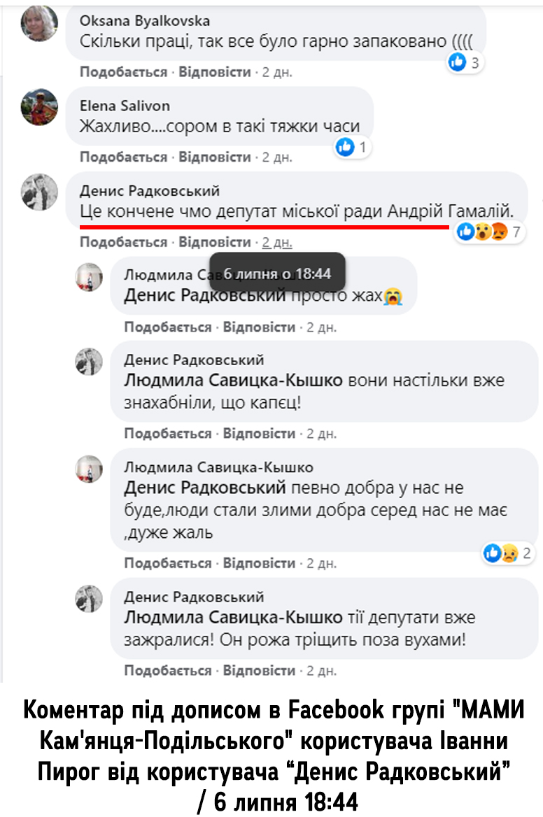 "У коментарях кам’янчани (а як виявилося, одна єдина фейкова сторінка "Денис Радковський") упізнали чоловіка в шортах. Ним виявився депутат Кам’янець-Подільської міської ради Андрій Гамалій (фракція "Рідне місто").