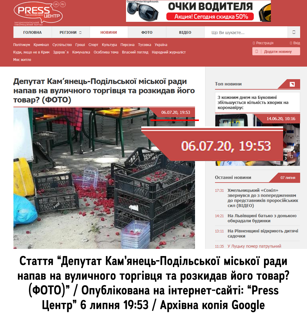О 19:53 з'являється стаття в інтернет-ресурсі "PressЦентр". В якій вже ніхто не ставить під сумнів, що на фото А.Гамалій. а те що він ще й депутат взагалі не залишає сумнівів, що саме він і перекинув ящики з малиною продавцю.