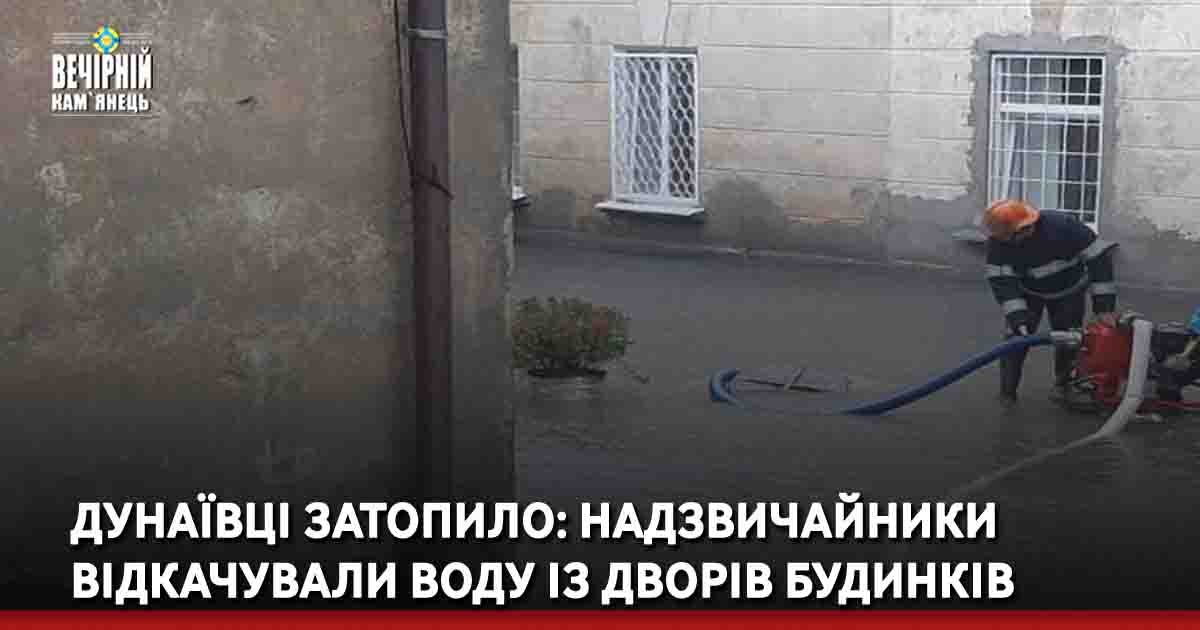 Внаслідок сильної зливи каналізаційні системи в Дунаївцях забилися і рятувальникам довелося відкачувати воду із затоплених прибудинкових територій.