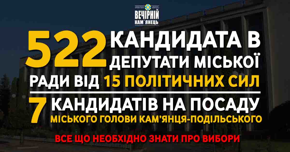 До Кам'янець-Подільської міської ради висунули свої кандидатури 522 осіб від 15 політичних сил. До відома на всій території України у виборах візьмуть участь – 144 партії.