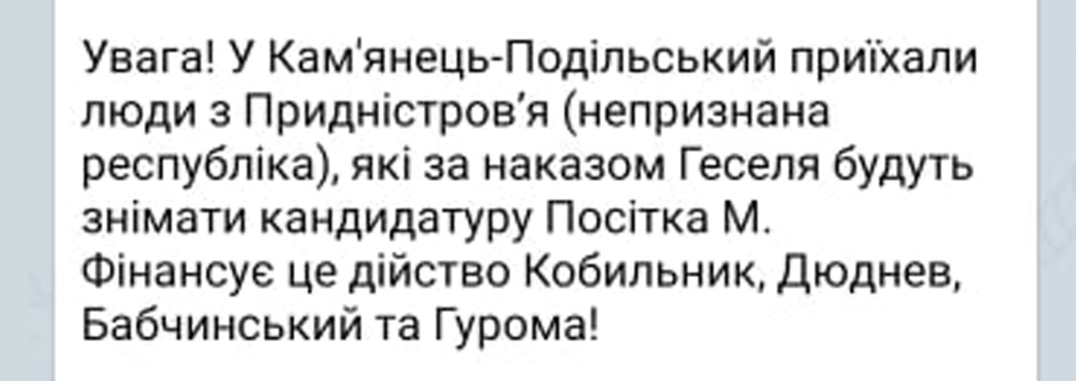 Останній приклад – створений напередодні виборів телеграм-канал на який досить часто посилається Посітко. На цьому ресурсі публікується відверто фейкова інформація про політичних конкурентів самого Посітка, однак він нібито до цього немає жодного відношення.