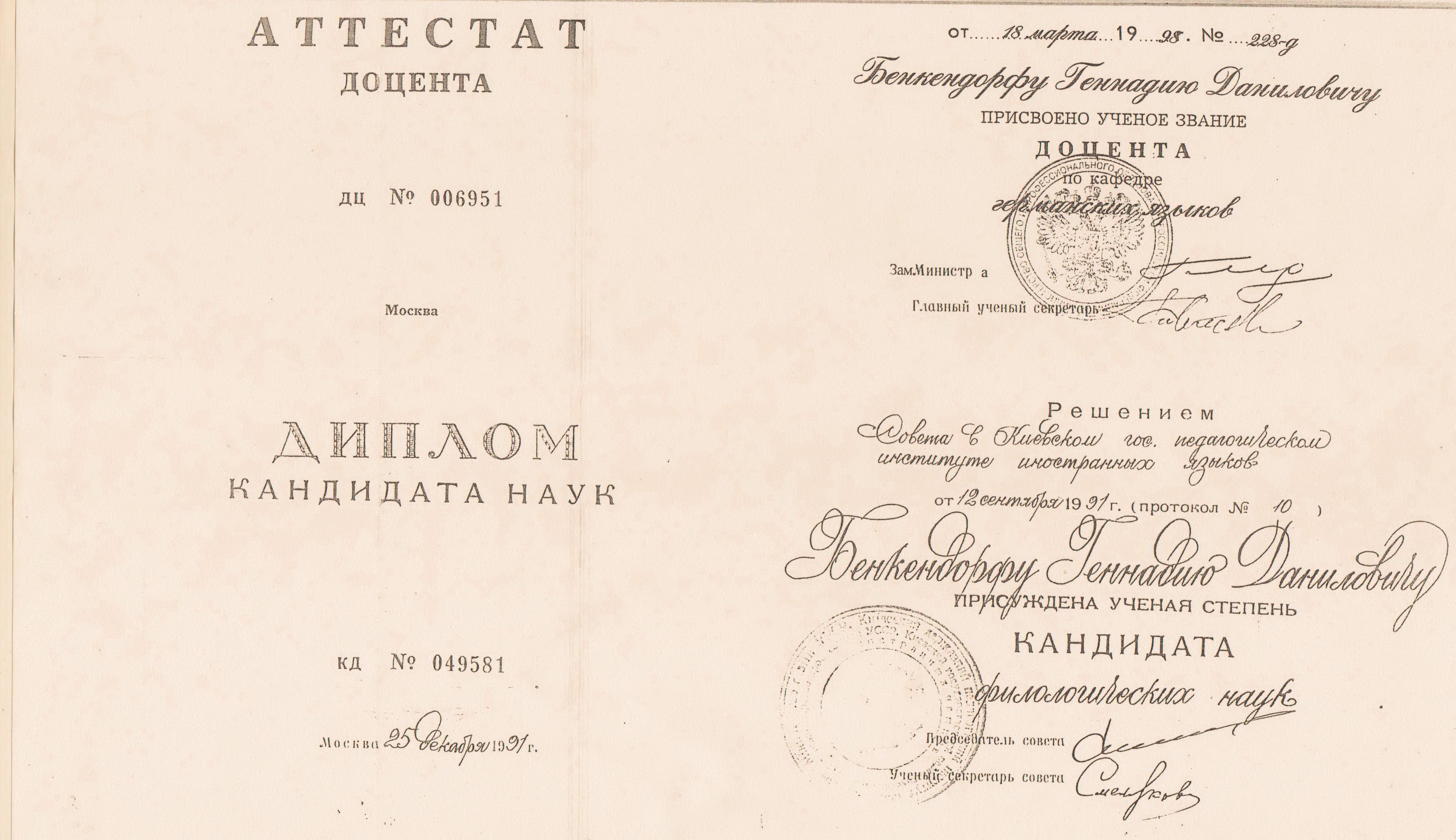 Диплом Геннадия Даниловича Бенкендорфа виданий в РФ
