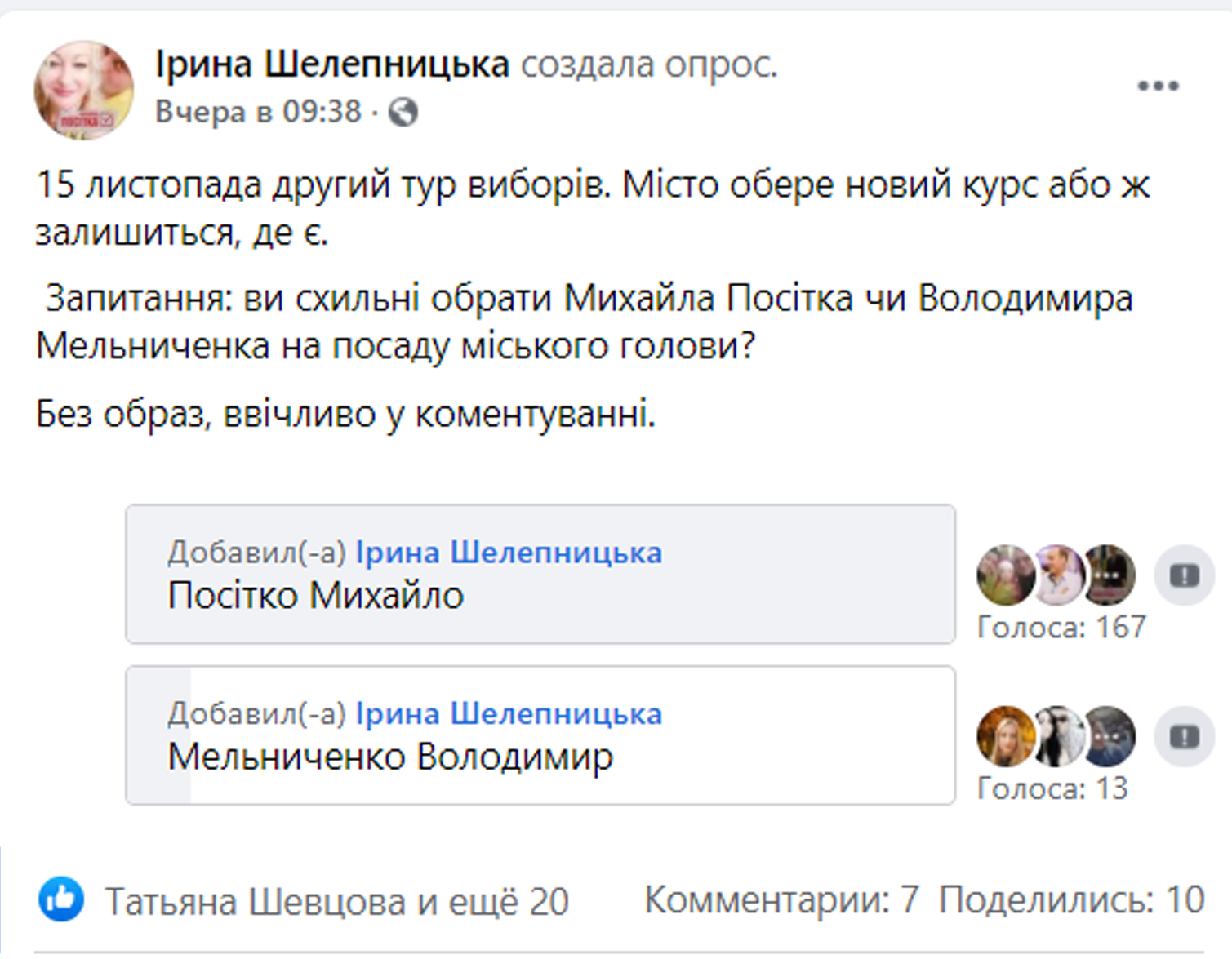 Однак за результатами голосування 25 жовтня Михайло Посітко набрав лише 35% голосів виборців, в той же час як лідер першого туру Володимир Мельниченко – 40%. Таким чином, всі соціологічні опитування, які подавалися командою Посітка як достовірні виявилися брехнею.