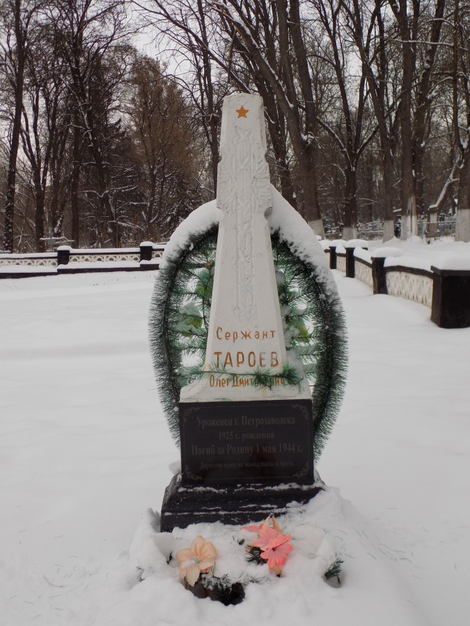 У 1947 році на могилі встановлено бетонний обеліск висотою 1,45 м.з написом: "Сержант Тароев Олег Дмитриевич уроженец г. Петрозаводска 1925 г. рождения погиб за Родину 1 мая 1944 г. Дорогому сыну от мамы, папы и брата". З іншого боку пам’ятника напис: "Умер от ран в п/п госпитале 47712".