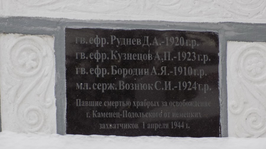 Поховані 4 воїни 63-ї гвардійської танкової бригади 10-го гвардійського танкового корпусу 4-ї танкової армії: єфрейтори БАРОЗИН Александр Яковлевич 1910 року народження, КУЗНЕЦОВ Андрей Петрович 1923 року народження, РУДНЕВ Дмитрий Афанасиевич 1920 року народження, уродженець Челябінської області, молодший сержант ВОЗНЮК Степан Іванович 1925 року народження, які загинули 29-30 березня 1944 року при визволенні міста Кам'янець-Подільський від німецько-фашистських загарбників.