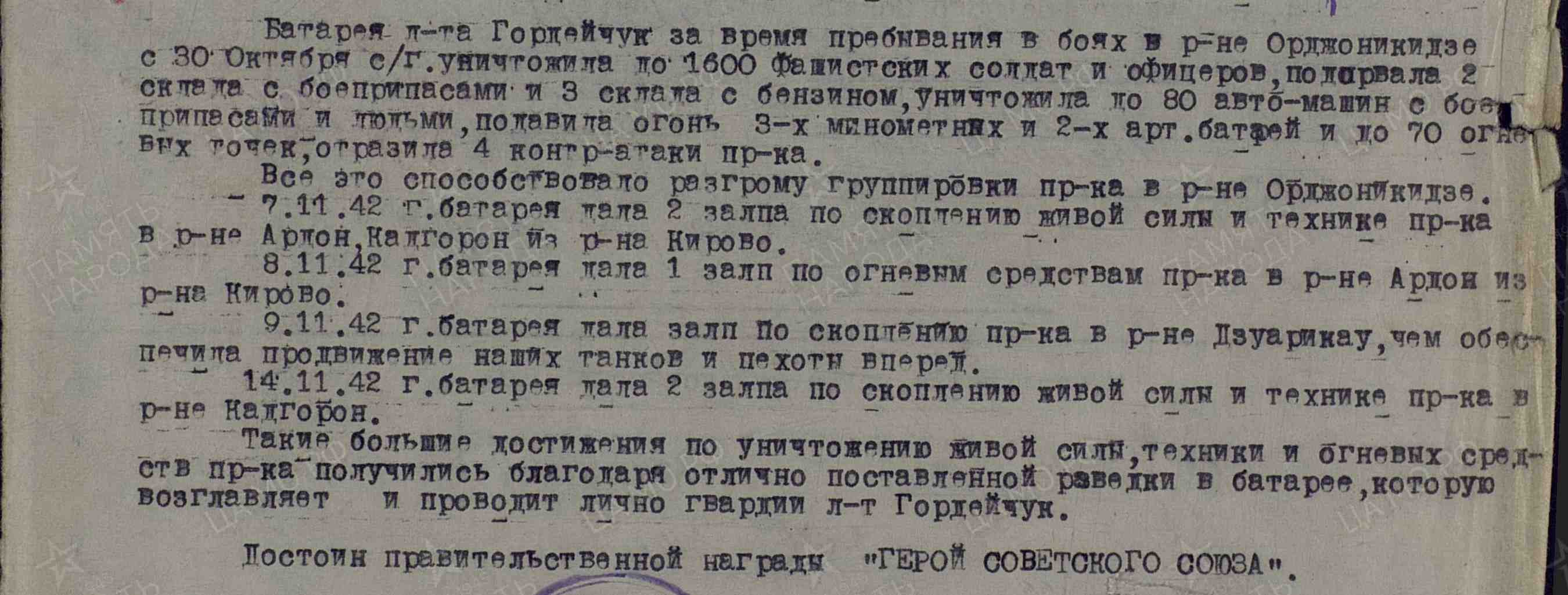 У серпні 1942 під час оборони Кавказу батарея, якою керував Григорій Гордійчук знищила дві переправи ворога на р. Терек. Також прицільним вогнем було знищено 6 танків, 20 автомашин та декілька рот піхоти.