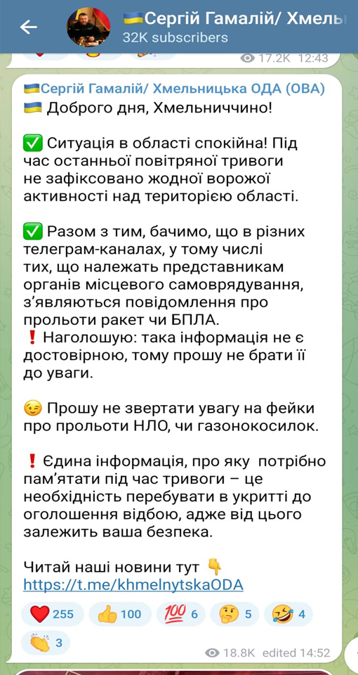 Пряма мова: « Ситуація в області спокійна! Разом з тим, бачимо, що в різних телеграм-каналах, у тому числі тих, що належать представникам органів місцевого самоврядування, з’являються повідомлення про прольоти ракет чи БПЛА. ❗️Наголошую: така інформація не є достовірною, тому прошу не брати її до уваги.