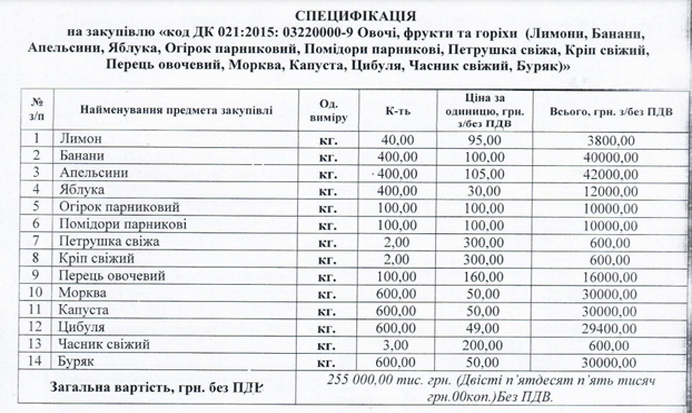 Так, за даними договору, банани планують купувати по 100 гривень за кілограм, апельсини 105 гривень за кілограм, яблука - по 30 гривень за кілограм, огірки та помідори - по 100 гривень за кілограм, моркву, капусту, буряк - по 50 гривень за кілограм.