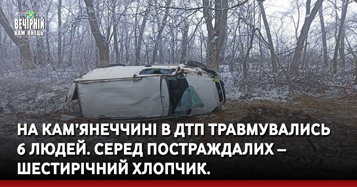 32-річний водій автомобіля марки «Фіат Добло», рухаючись з міста Дунаївці в напрямку міста Хмельницький, допустив з’їзд автомобіля із проїжджої частини із подальшим перекиданням, внаслідок чого постраждав водій та п’ятеро пасажирів. Усі вони доставлені до медичного закладу з травмами різного ступеню тяжкості. Серед постраждалих – шестирічний хлопчик.