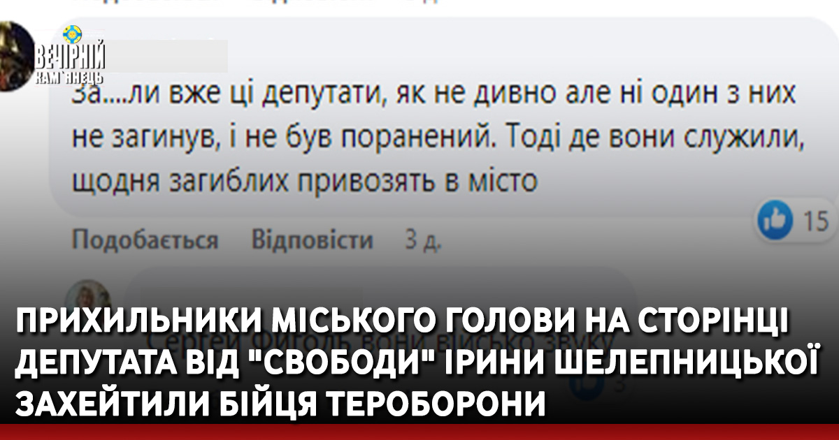 Прихильники міського голови Кам'янця-Подільського на сторінці депутатки від ВО "Свобода" Ірини Шелепницької, яка фактично є правою рукою та спікером від мера ( на сесіях міської ради, принаймні ) захейтили (загнобили) бійця Тероборони.