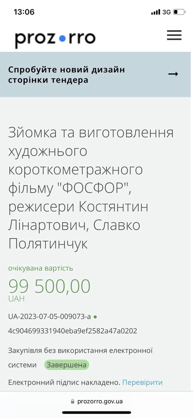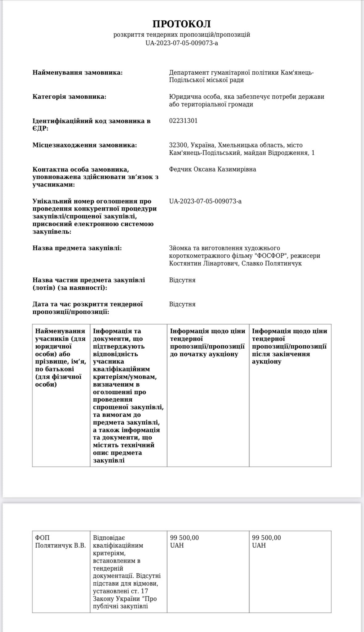За даними порталу закупівель Прозорро майже 100 тисяч грн (99 500) департамент гуманітарної політики міської ради витратить на зйомку та виготовлення художнього короткометражного фільму "ФОСФОР".