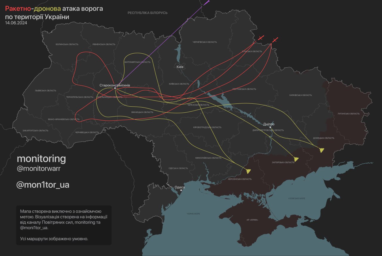 Орієнтовну карту руху крилатих/балістичних ракет та ударних БпЛА, що атакували Україну у ніч на 14.06.24 опублікував Телеграм-канал monitorwar.