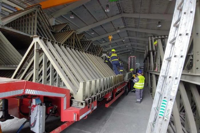 Конструкцію двох мостів перевозять двадцять автомобілів.