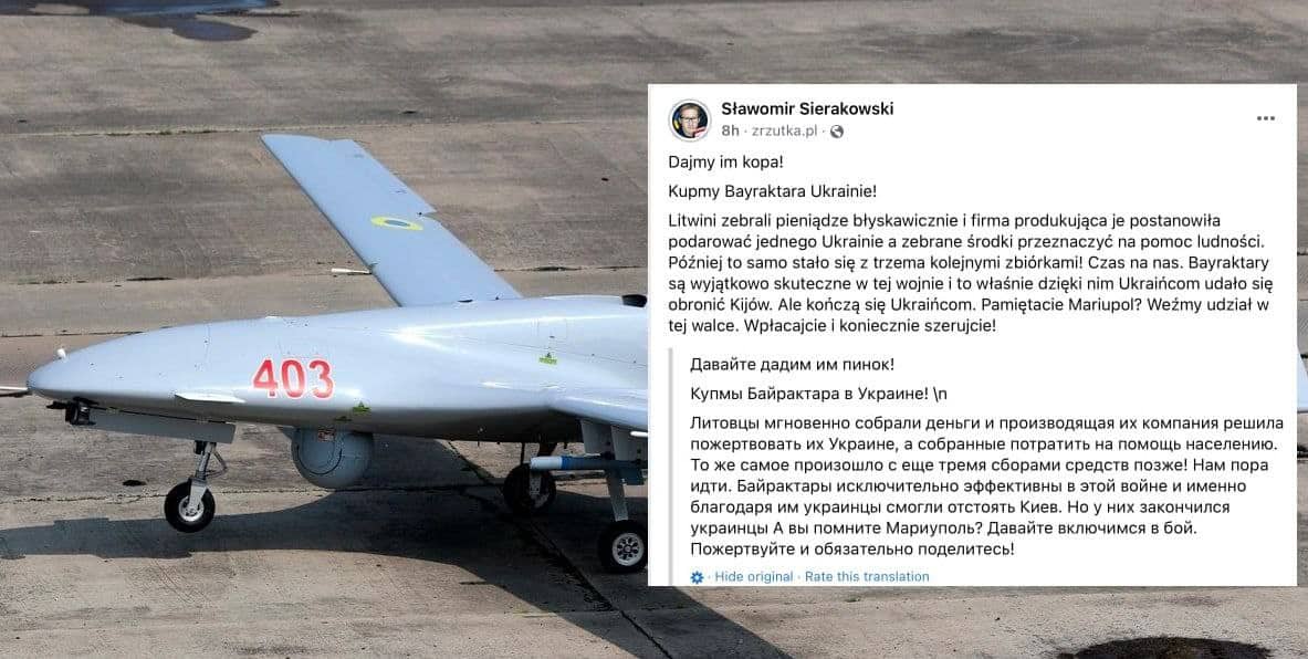 «Пора і нам. Пам’ятаєте Бучу, Ірпінь, Маріуполь? Візьмімо участь у цій боротьбі. Купимо польський "Байрактар"», — написав Сераковський.