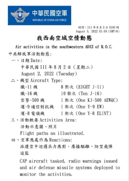 Увечері 2 серпня 24 бойові літаки з Китаю увійшов у повітряний простір Тайваню. Повідомлення про це з'явилося на офіційній сторінці Міністерства оборони Тайваню у Твіттері, передає Фокус.