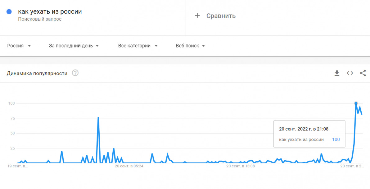 Примітно, що також були на піку популярності запити "відстрочка від армії" і "куди можна виїхати з росії без візи", "як виїхати з росії без закордонного паспорта", "як виїхати з росії без грошей".