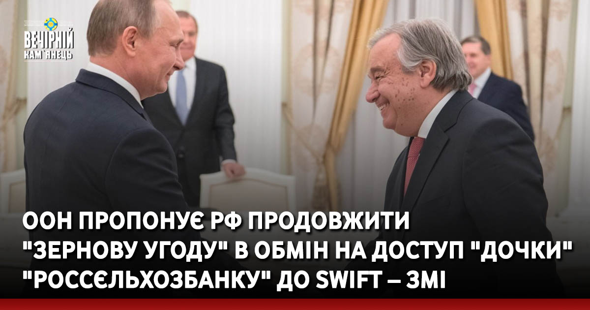 Генсек ООН Антоніу Гутерріш запропонував президенту РФ Путіну продовжити "зернову угоду" в обмін на підключення "дочки" "Россєльхозбанку" до міжнародної платіжної системи SWIFT.