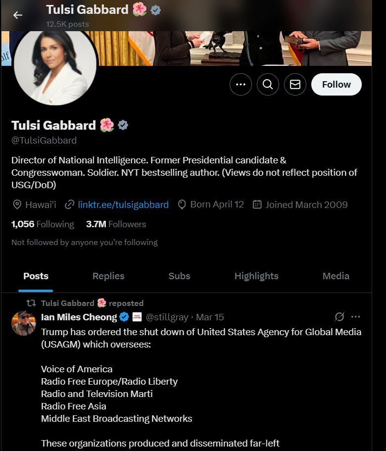 Фінський інфлюєнсер Пекка Калліоніємі зауважив, що очільниця національної розвідки Сполучених Штатів Тулсі Габбард зробила репост допису Яна Майлза Чонга – малазійсько-китайського проросійського пропагандиста, який є оглядачем Russia Today.