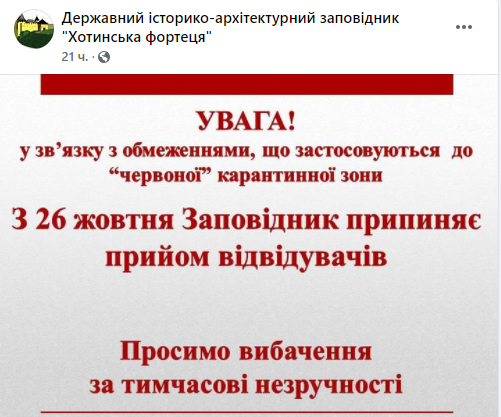 Таке рішення пов'язане з рішенням Державної комісії з надзвичайних ситуацій, яка напередодні віднесла Хотинський район Чернівецької області до "червоної зони" епідемічної небезпеки, повідомляють у пресслужбі історико-архітектурного заповідника.