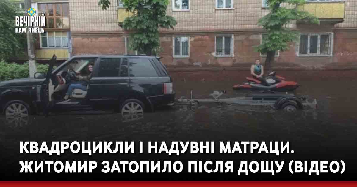 Вулиці в центрі Житомира затопило після сильної зливи, і деякі городяни вирішили покататися на гідроциклах і надувних матрацах.