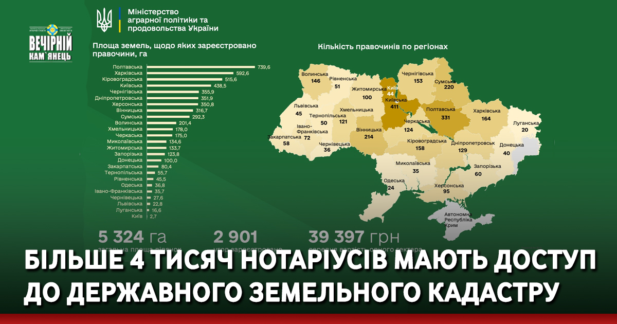 "До речі, вже більше 4 тисяч нотаріусів мають доступ до Державного земельного кадастру (ДЗК), який необхідний для перевірки дотримання покупцем обмеження щодо площі сільгоспземель “в одних руках”. Загалом же заявки на підключення до ДЗК подали 4255 нотаріусів", — інформує Горовець.