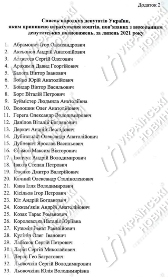 Також цих виплат позбавлені глави аграрного комітету Микола Сольський, депутати від "Опозиційної платформи" Віктор Медведчук, Ілля Ківа, Тарас Козак, депутат від групи "Довіра" Сергій Шахов, позафракційні депутати Олександр Дубинський і Гео Лерос.