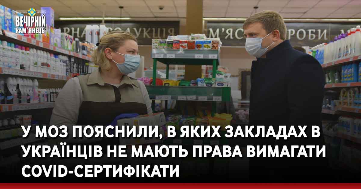 У Міністерстві охорони здоров’я пояснили, що вимога надавати сертифікат про вакцинацію не поширюється на відвідування банків, АЗС, ветеринарних магазинів, аптек та всіх продовольчих магазинів на будь-якому рівні епіднебезпеки.