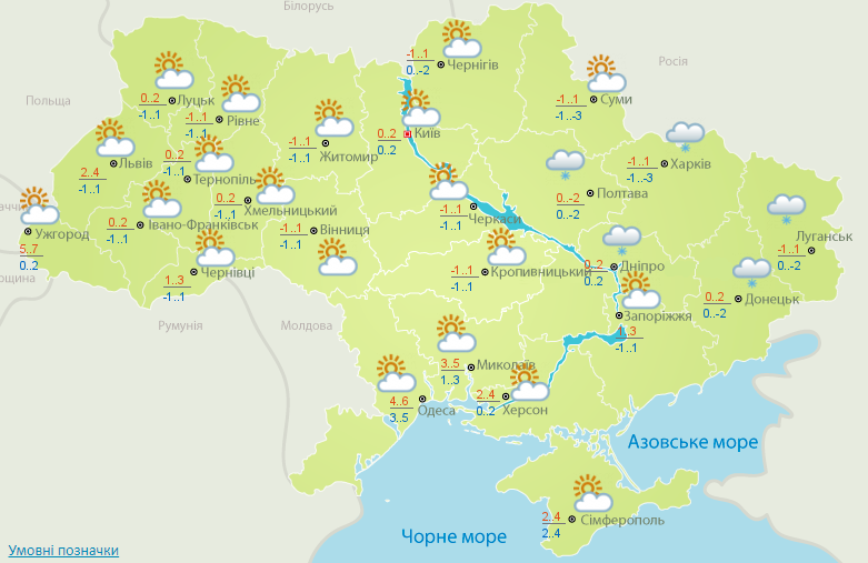 Перші зимові опади очікуються в Полтавській, Дніпропетровській, Харківській, Луганській та Донецькій областях. При цьому денні температури будуть на рівні -1°...+2°.