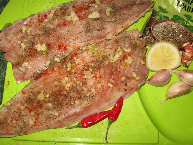 Розчавленим часником і приправою для риби змазуємо філе і залишаємо маринуватися хоча б на півгодини.