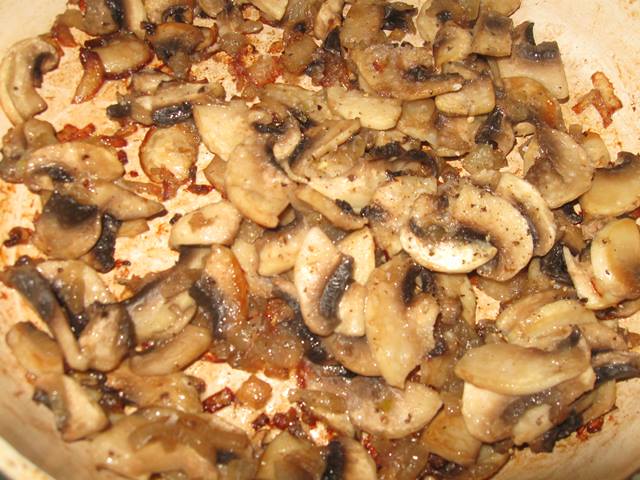 Одну цибулину нарізаємо дрібно. Будемо її тушкувати на оливковій олії разом з нарізаними шампіньйонами. Солимо, перчимо.