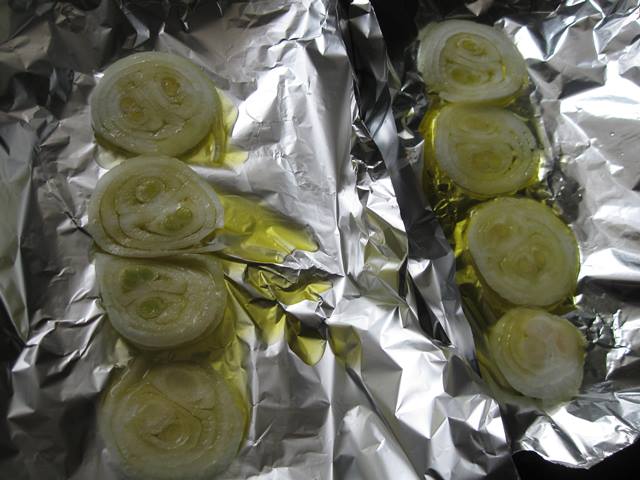Викладаємо кільця цибулі на фольгу і скроплюємо її оливковою олією.