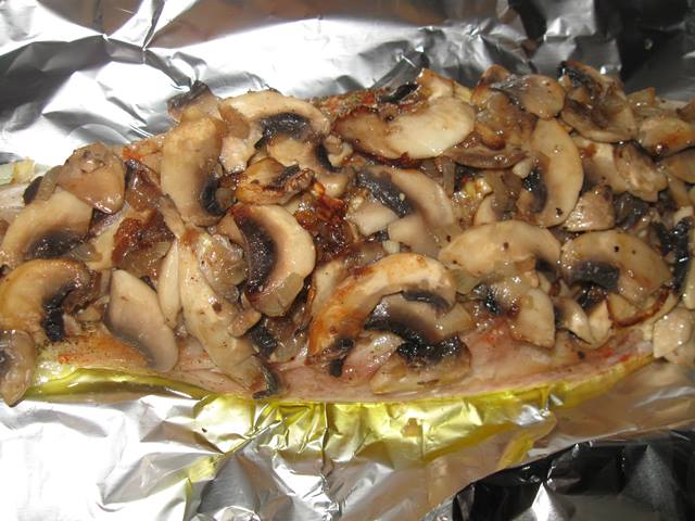 Зверху на філе скумбрії викладаємо шар тушкованих грибів з цибулею