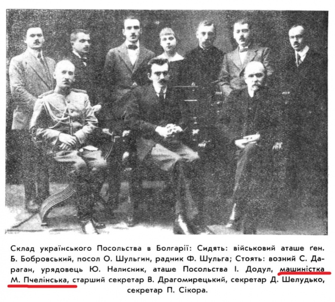 Постать Марії Пчелінської канула б у небуття, якби не чорно-біла знимка за 1919 рік, на якій вона серед команди дипломатів посольства УНР в Болгарії та скромний підпис "М. Пчелінська, стенографістка посольства".