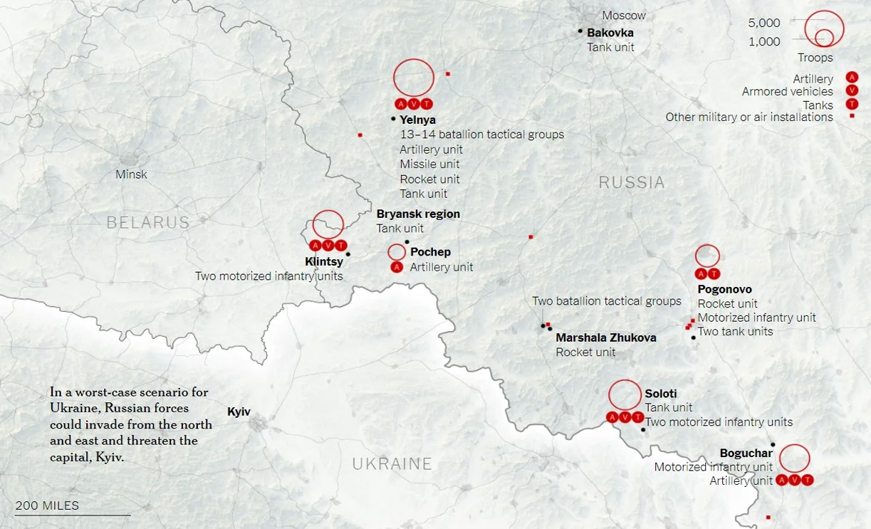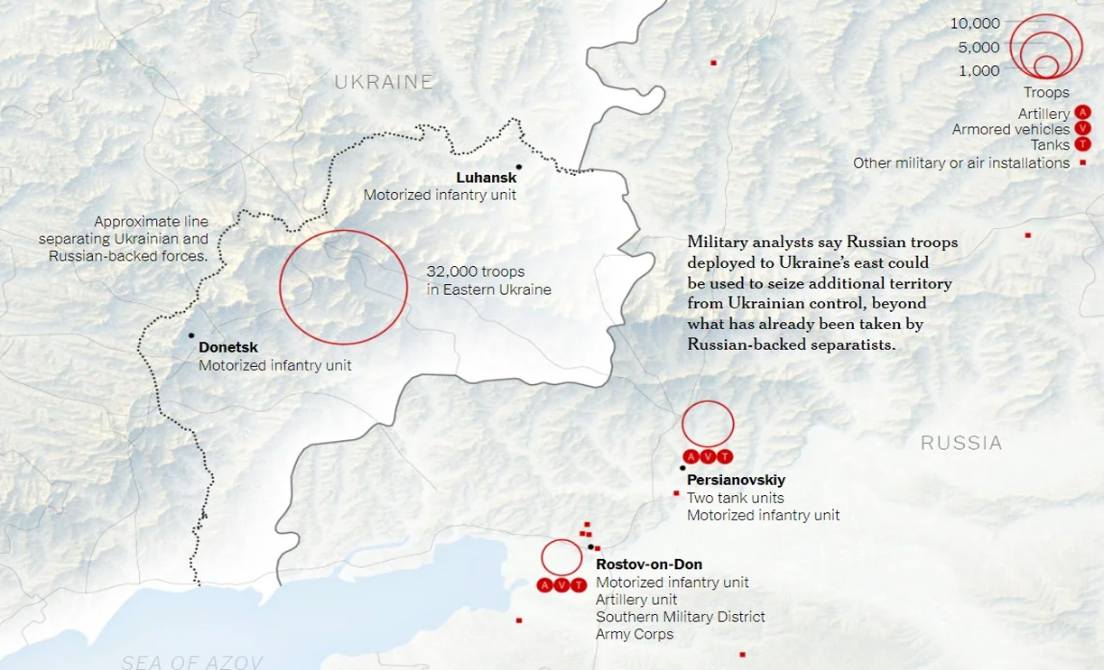 На загальній карті, оприлюдненій NYT, видно актуальну дислокацію російських підрозділів. Окремо зазначається, що на сході України, у районі, контрольованому «Л/ДНР», сконцентровано 20 тис. військ, а угруповання сил на півночі «загрожує Києву» і може бути націлене на розтягування сил української оборони.