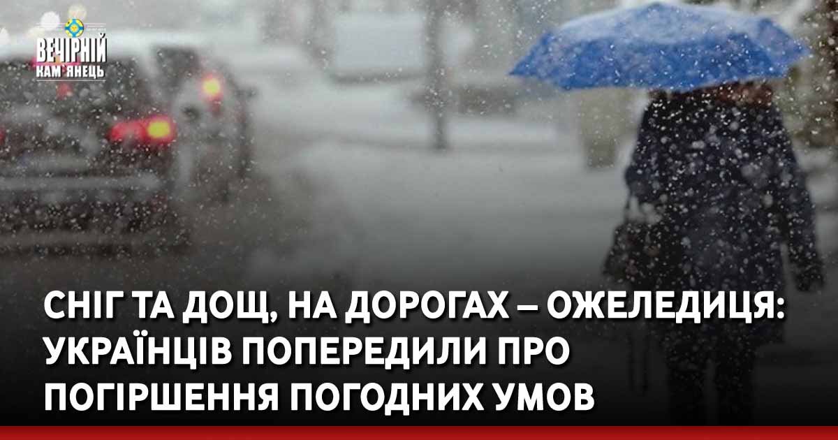 На всій території України у неділю, 9 січня, очікується погіршення погодних умов. Зокрема, будуть мокрий сніг та дощ, а на дорогах - ожеледиця.