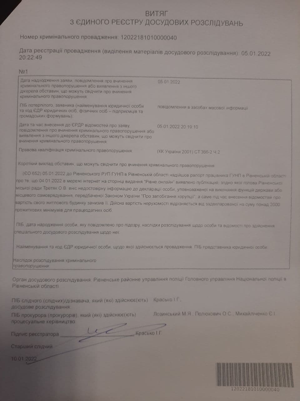 Після розслідування Rivne.online: «Новорічні знижки для Третяка: скільки насправді коштує новий будинок мера Рівного» та викликаного ним суспільного резонансу, у поліції Рівного відкрили кримінальне провадження.