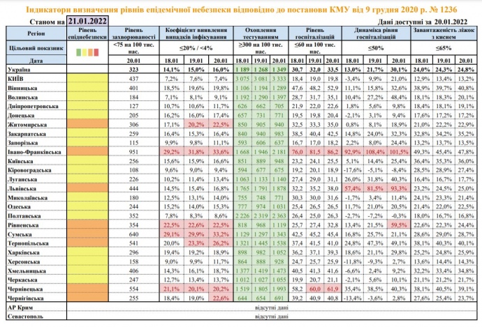 Станом на ранок 21 січня в Україні 8 областей віднесено до помаранчевої зони епідемічної небезпеки: Івано-Франківська, Львівська, Рівненська, Тернопільська, Чернівецька, Житомирська, Чернігівська та Сумська.