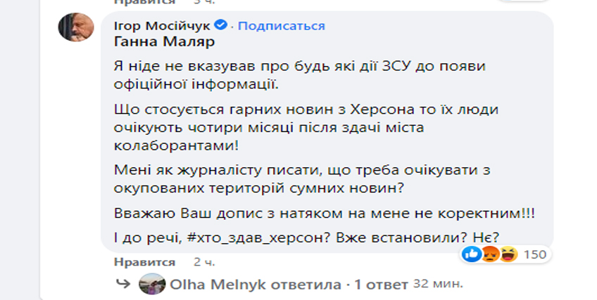 Зі слів Маляр цим вони шкодять ЗСУ. Оскільки, інформація про звільнення чи втрату населеного пункту, надана до завершення операції, вважається некоректною.