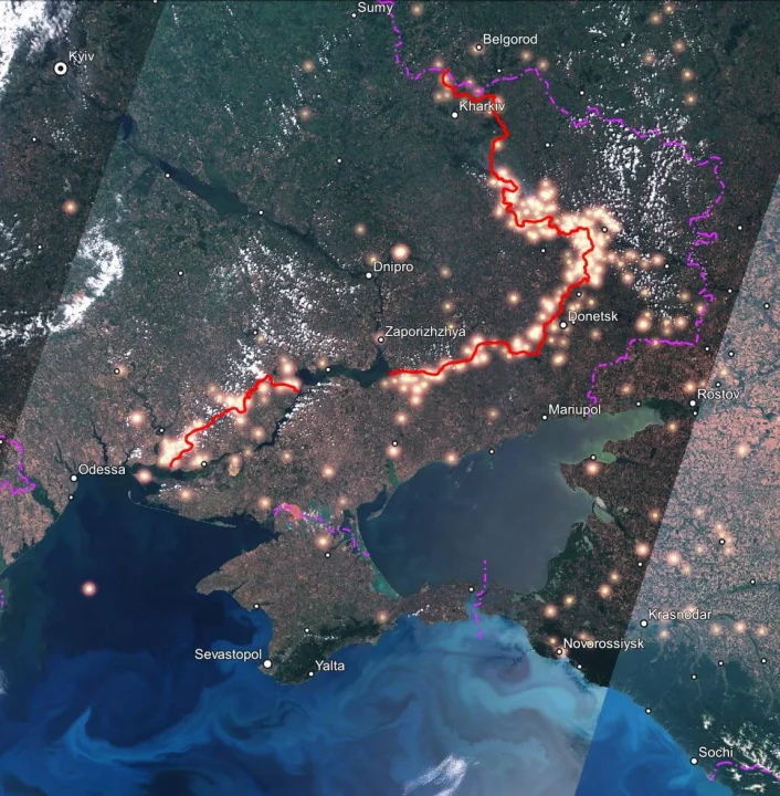 Лінію фронту в Україні видно навіть із космосу. Система Firms NASA, яка займається виявленням великих пожеж, зафіксувала найгарячіші точки.