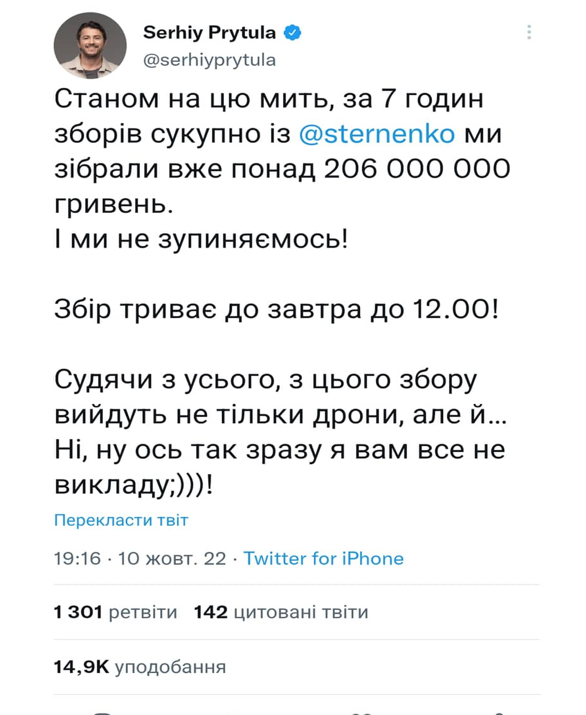 О 19:07. Притула повідомив, що за перші 7 годин загалом вдалося зібрати понад 206 мільйонів гривень. Збір триватиме до 12:00 11 жовтня.