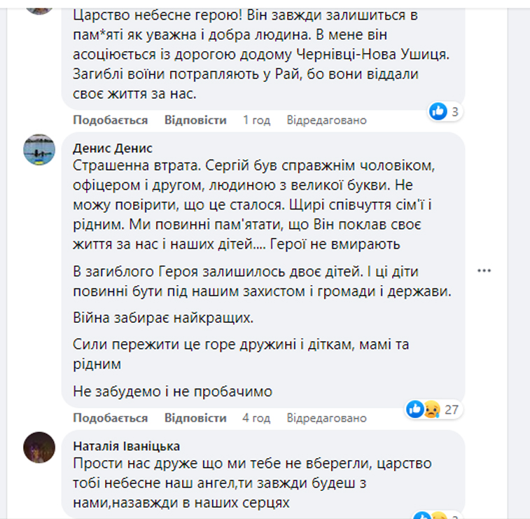 пишуть під дописом про загиблого на фронті Сергія Тернавського