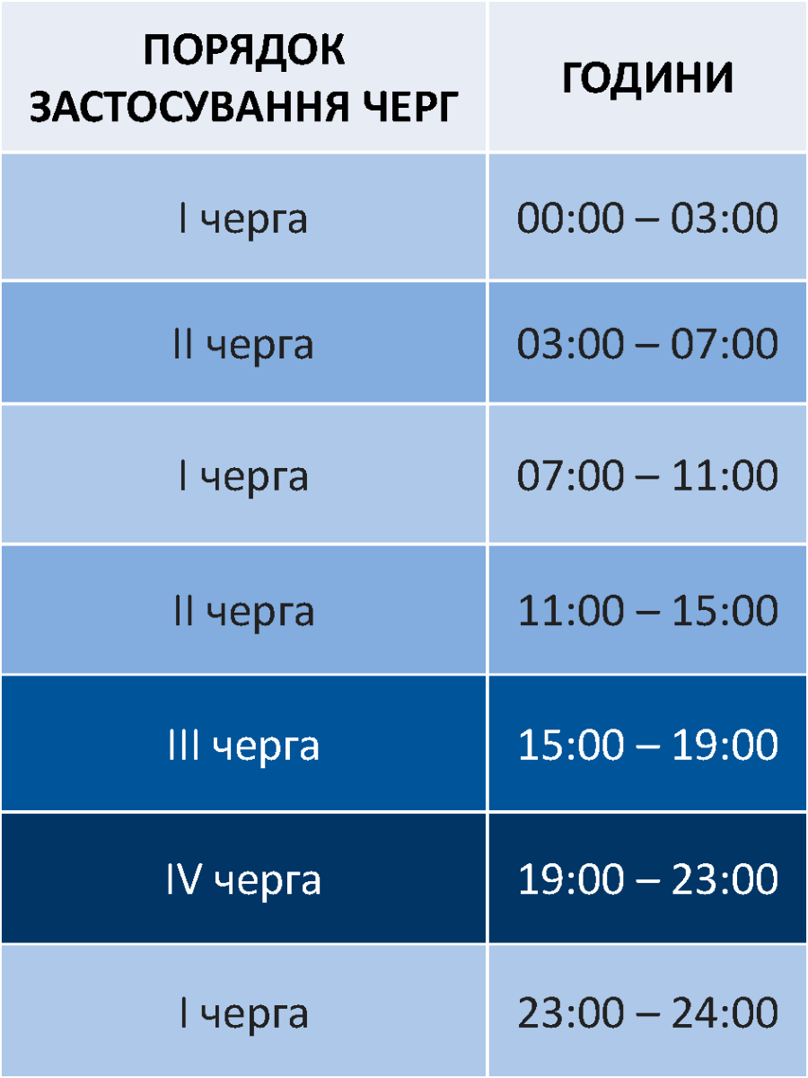 Графік погодинних відключень застосуватиметься цілодобово, але вже не по дві черги одночасно, а по одній.