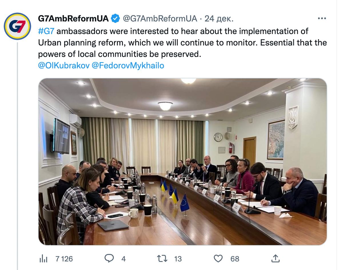 "Коли посли країн "Великої сімки" після зустрічі з віцепрем'єр-міністром - міністром розвитку громад Олександром Кубраковим та віцепрем'єр-міністром – Мінцифри Михайлом Федоровим заводять мову про необхідність зберегти повноваження громад, в перекладі з дипломатичної це означає, що G7 зовсім не у захваті від містогвалтівного закону 5655. Саме цей закон зараз лежить у Президента на столі, чекаючи ухвалення або вето", - пише Черненко.